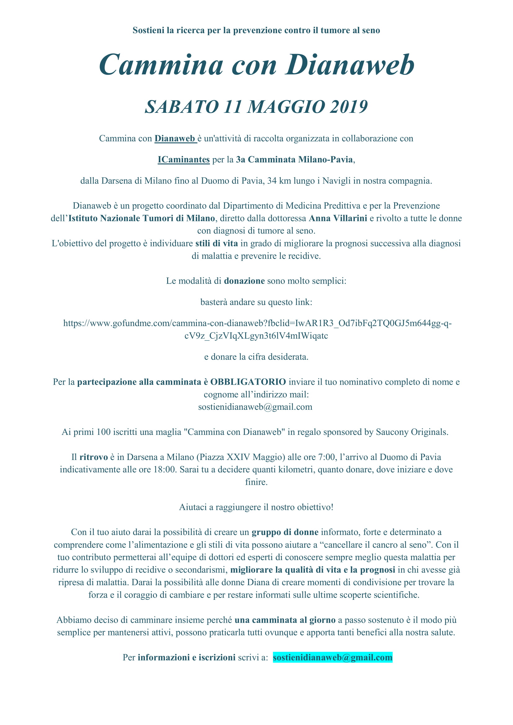Ai primi 100 iscritti una maglia "Cammina con Dianaweb" in regalo sponsored by Saucony Originals.